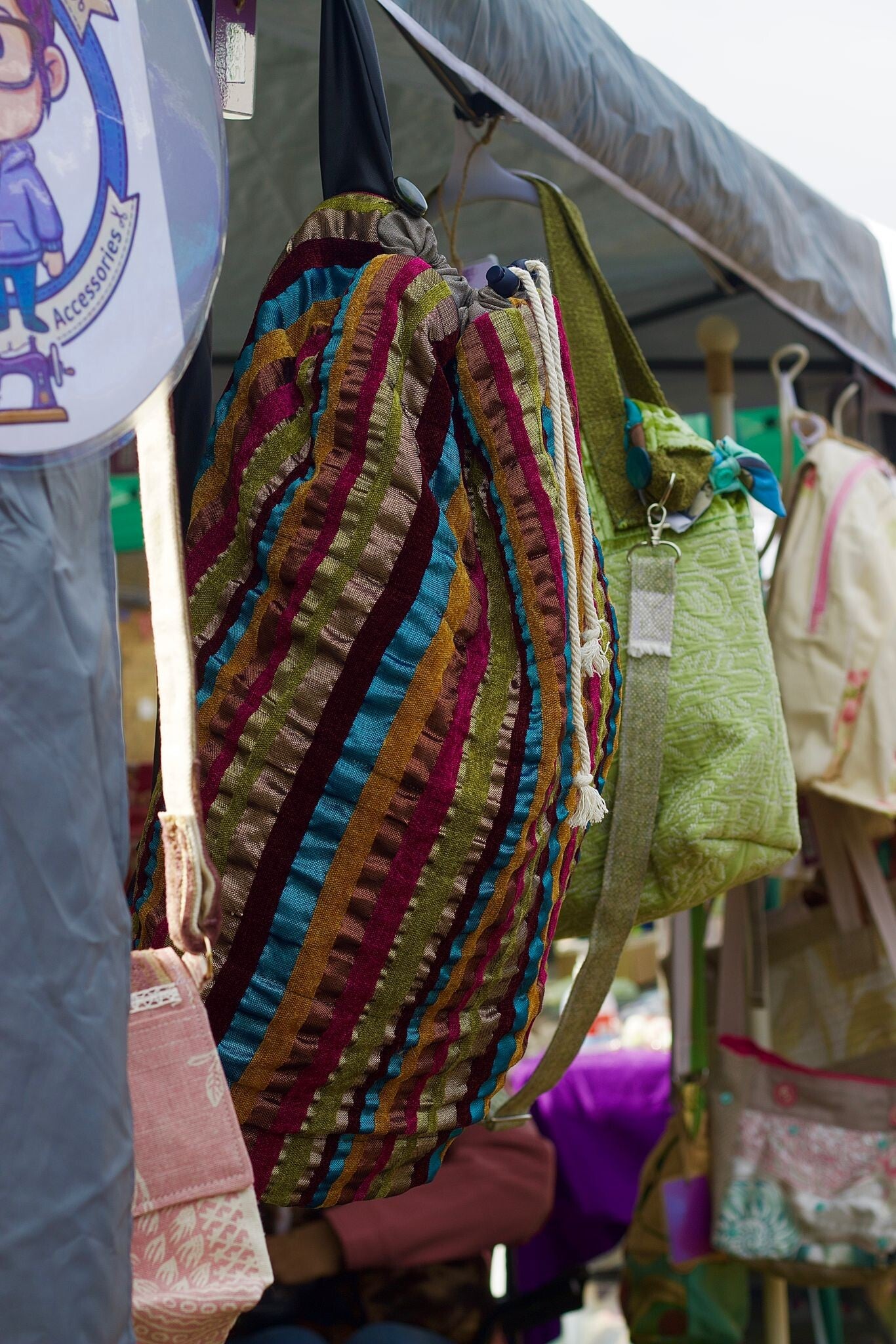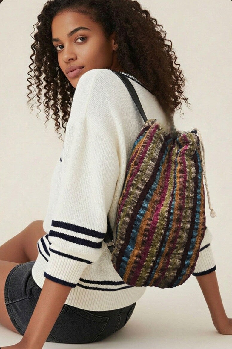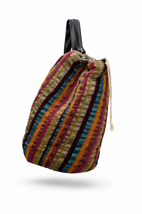 Make a bold statement with the most textured piece in our Drawstring Collection. This eye-catching bag features a rich, black woven base adorned with plush, multi-colored velvet stripes that catch the light with every move.