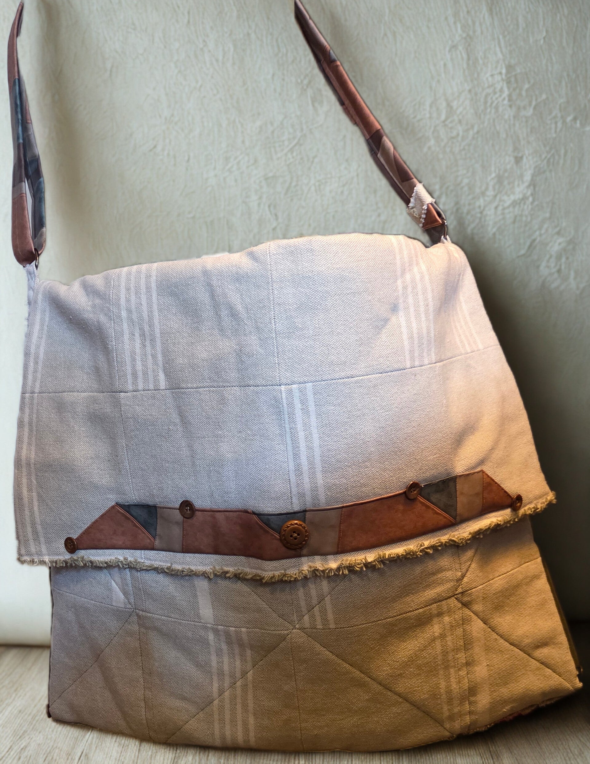 The fabric woven with a sage green and white patteren, the bag is padded and fully lined, there are 2 hidden pockets under the front flap, internally there is a larger pocket. The flap closure is sealed by 2 magnetic clasps. The faux leather strap is fully adjustable and there is a faux leather side strap.