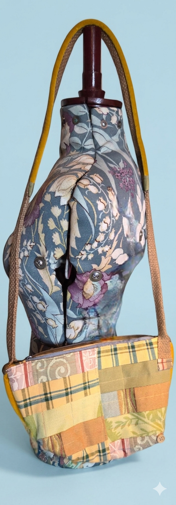 The bag is made from a patchwork of brightly coloured fabrics sewn together to from a uniquly patterened bag, with a yellow trim that matches the strap. There is 1 external and 1 interal pocket both with zip closures, and a 2nd internal pouch pocket made from beautifully patterened material. With the addition a button detailing to the outide, The Minstrel is a truly unique bag and a guaranteed conversation starter.