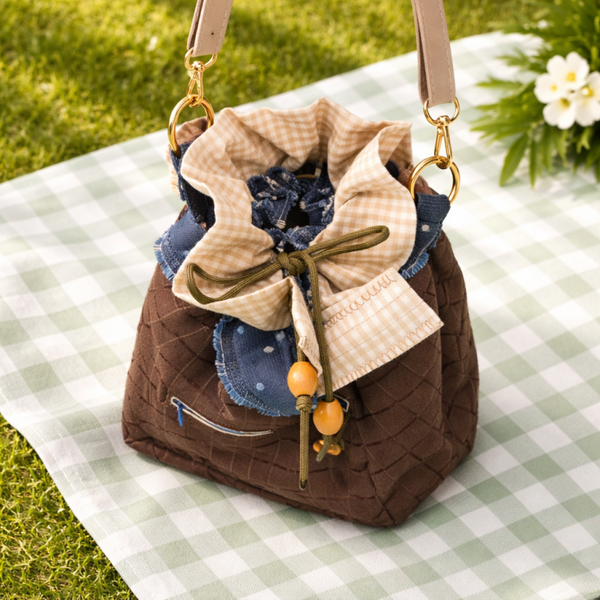 This lightly padded, square-based drawstring bag is built for style and durability. It features a sturdy navy and brown heavy-woven base, rising into a rich chocolate body. The "junction" comes alive at the top with a charming coffee-and-white gingham trim, set against a denim-style band. Look closely and you’ll find our signature multicoloured eyelets, adding a cheeky pop of color where the khaki cord cinches it all together.