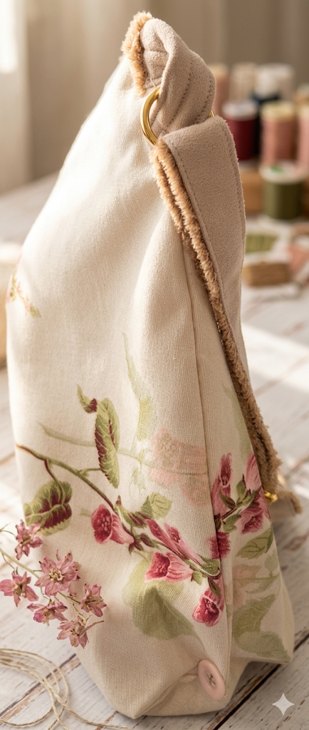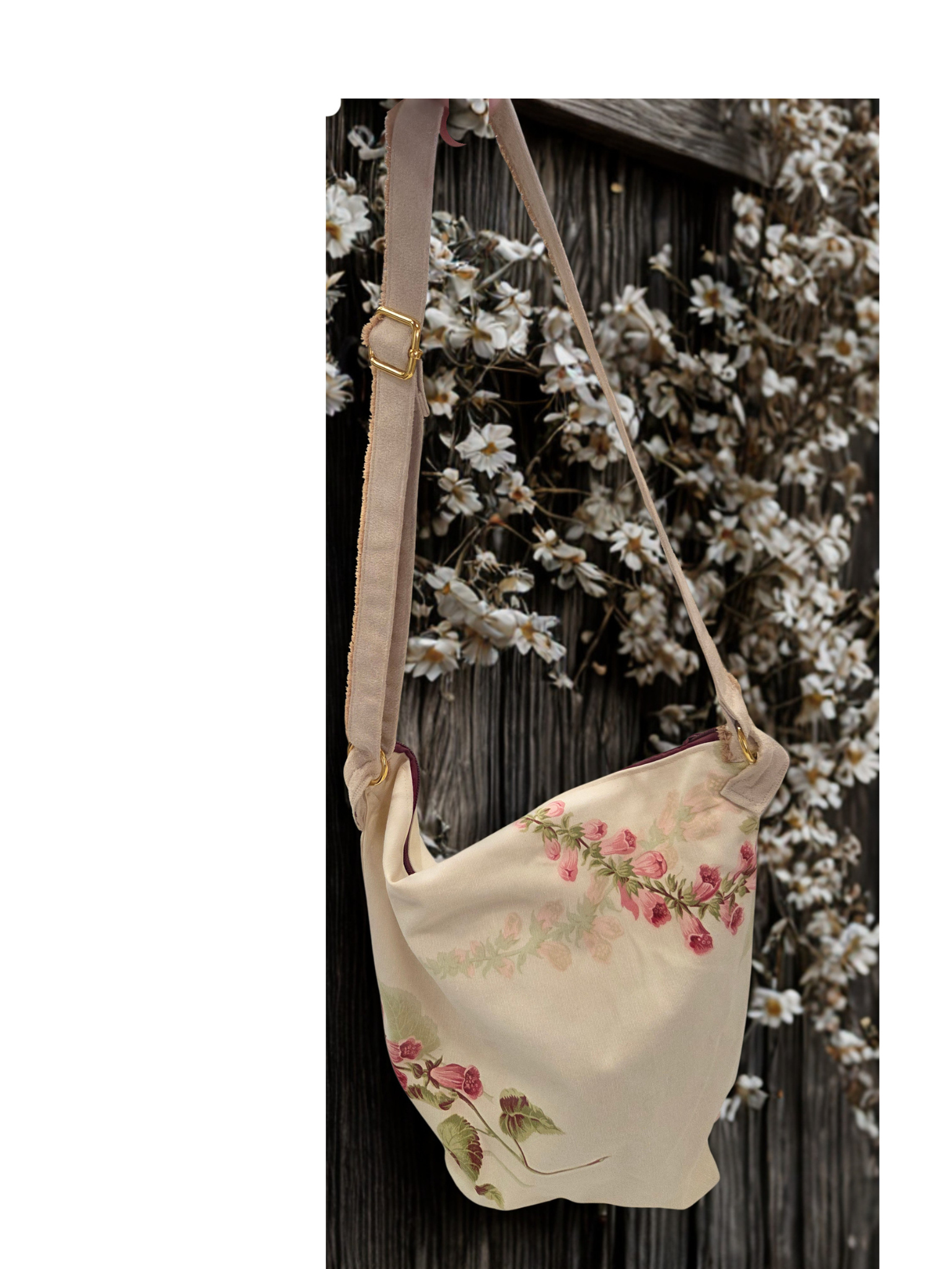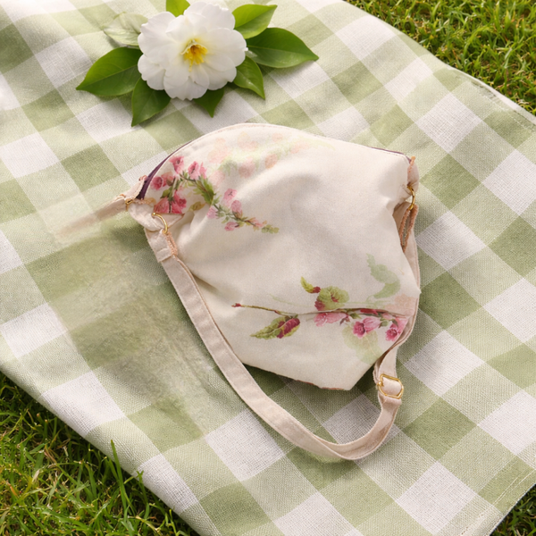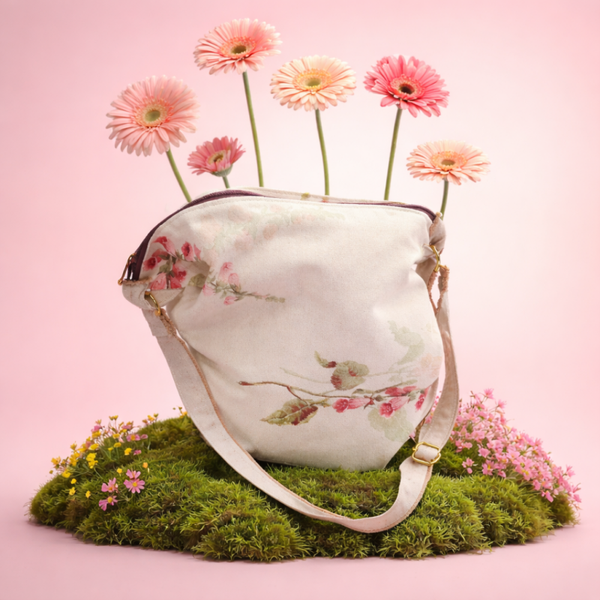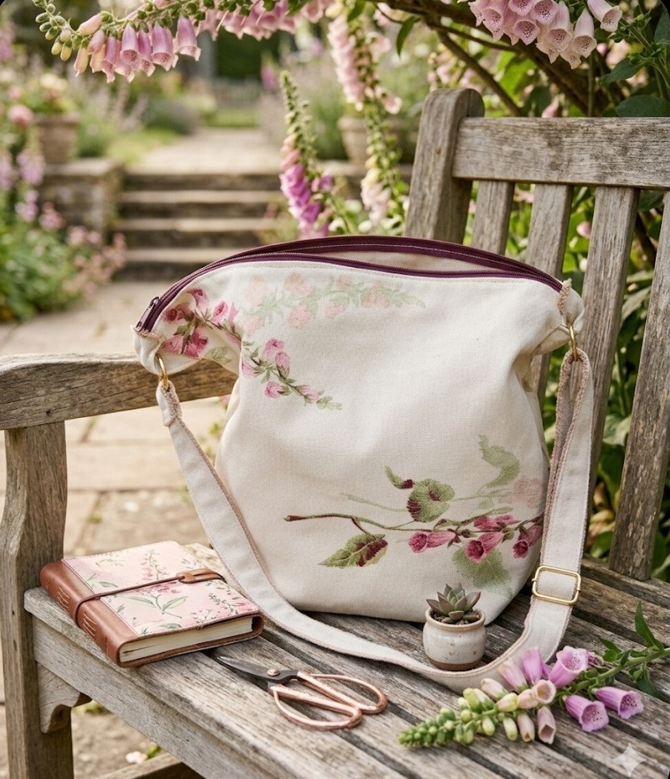 A standout piece from our Country Collection. This crossbody combines the rustic charm of a medium-weight woven cotton blend with the striking elegance of pink Foxglove stems.