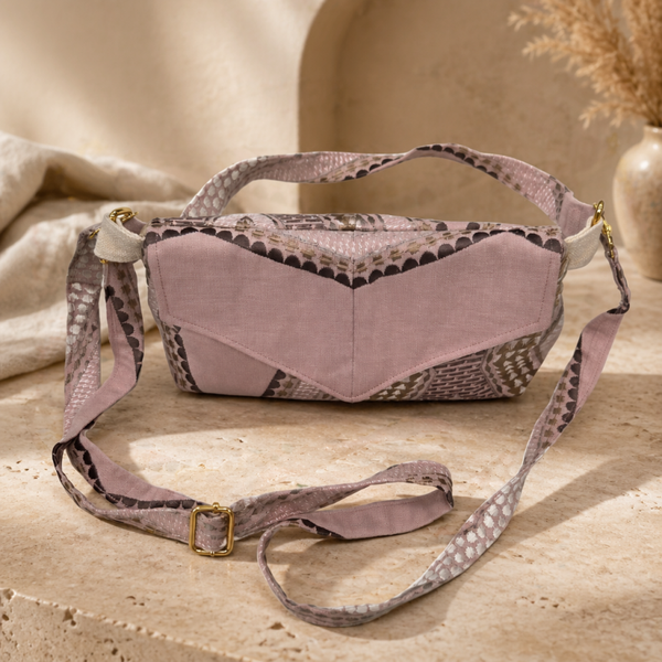 Experience ultimate versatility without sacrificing style. Handcrafted with an imaginative mix of textured fabrics, this multiway bag is designed for the woman whose day is as dynamic as her wardrobe. Featuring a beautiful interplay of dusty pink tones and geometric patterns, it’s a wearable piece of art that adapts to your needs.